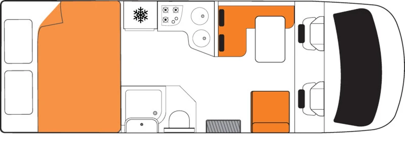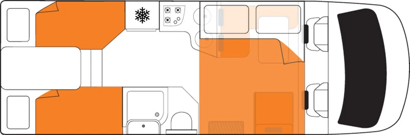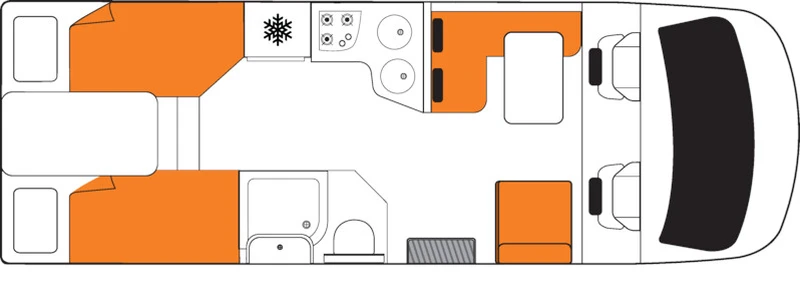 O Wanderer comporta até 4 adultos e foi projetado para oferecer um bom nível de espaço interno. O banheiro completo, com toalete e ducha, torna a rotina de viagem bem mais prática, especialmente em roteiros mais longos. A cozinha completa dá suporte para que o grupo prepare refeições com tranquilidade. É uma escolha sólida para quem quer viajar com amigos ou família, compartilhando a experiência com conforto.