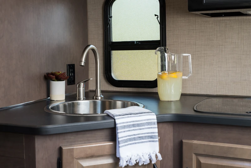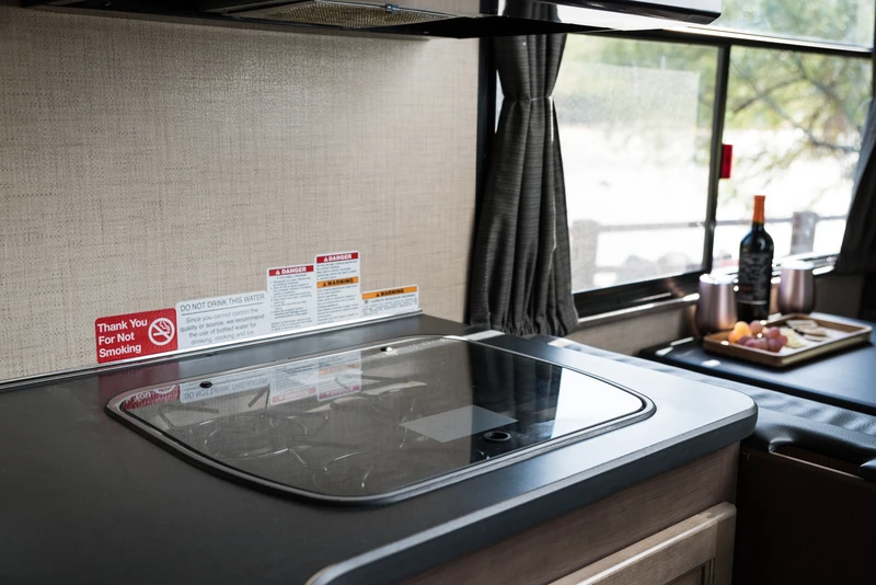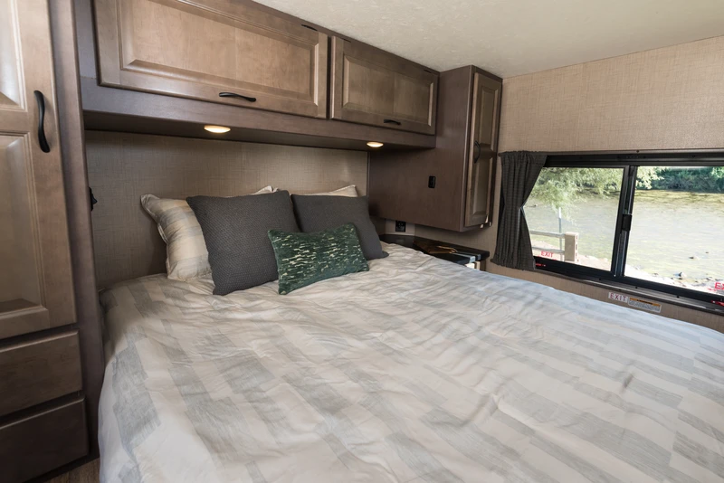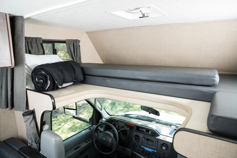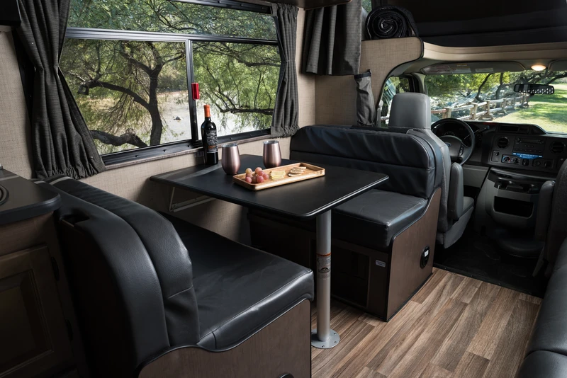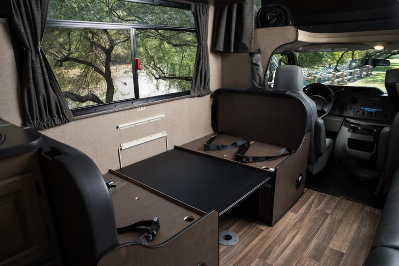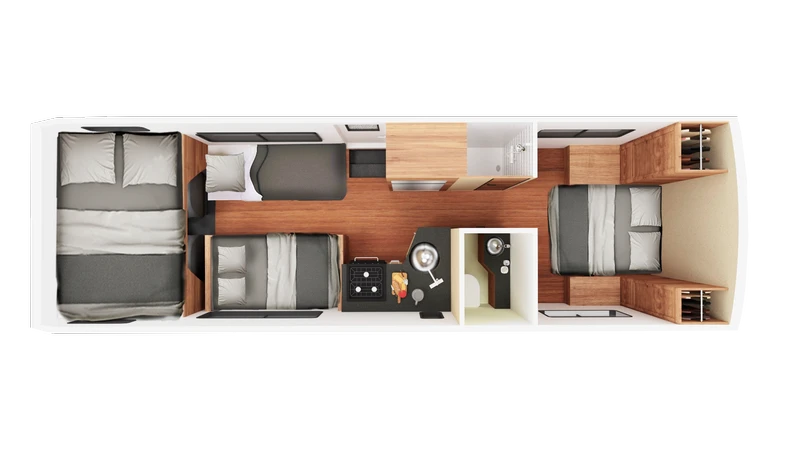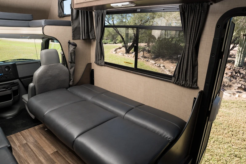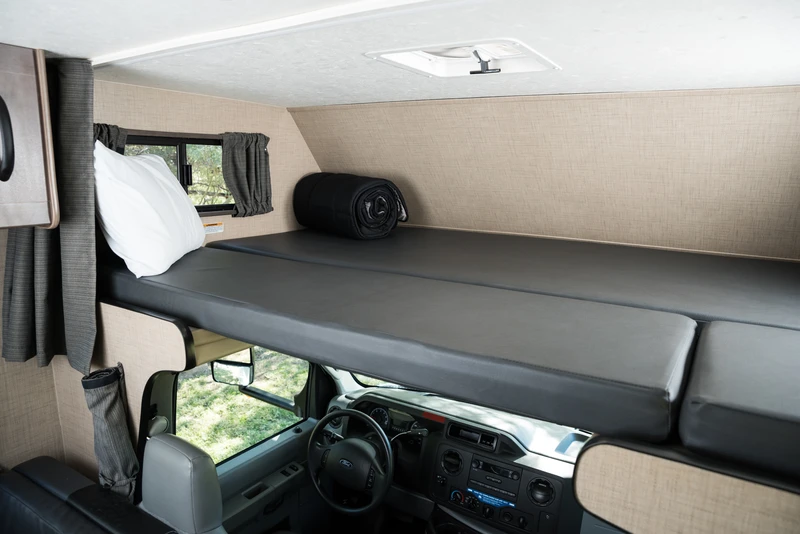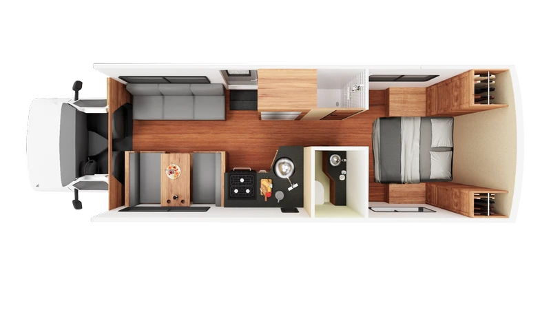 O C30 é um de nossos maiores veículos, sendo capaz de acomodar até 7 pessoas. Ele oferece um quarto privativo na parte traseira, cama de casal na cabine, um sofá-cama conversível e uma cama conversível na pequena sala de jantar. O veículo também oferece um chuveiro separado do vaso sanitário.