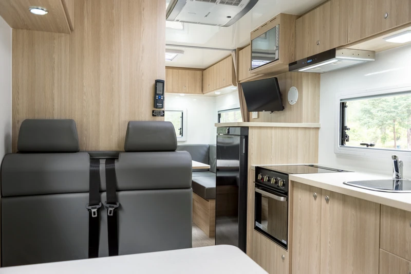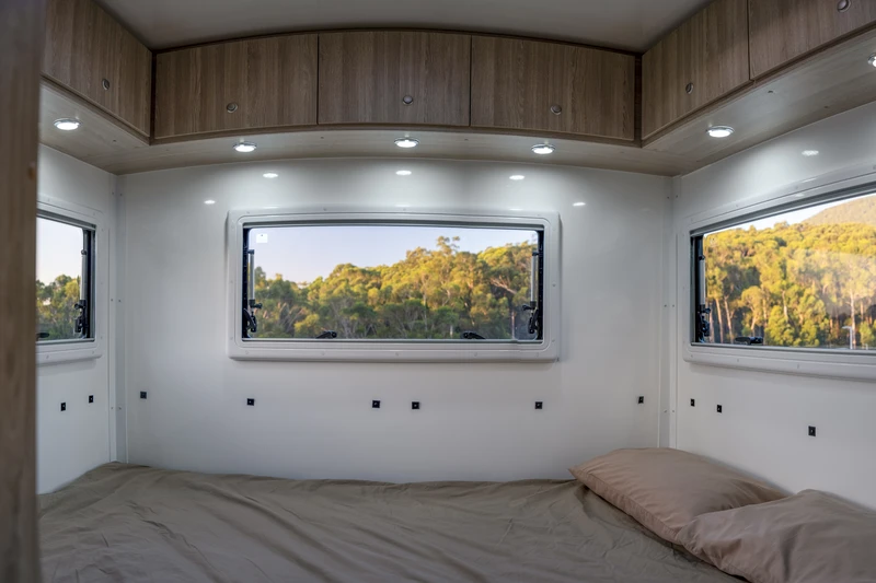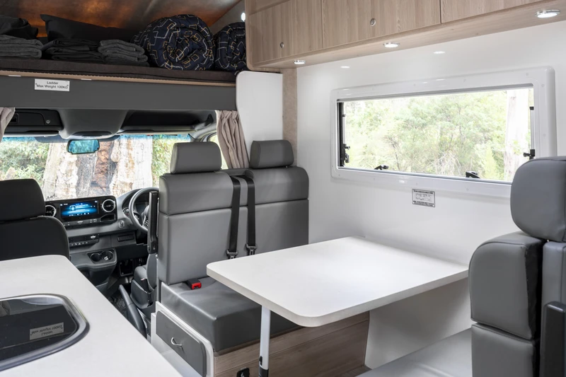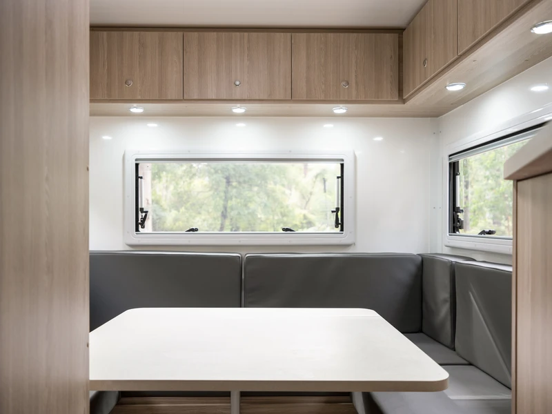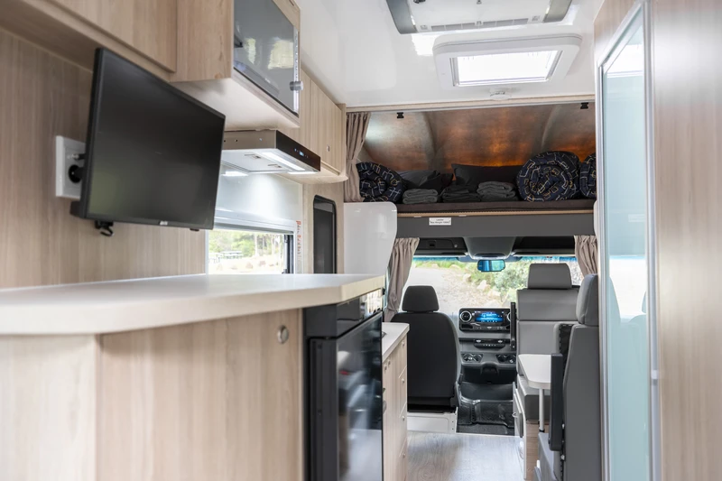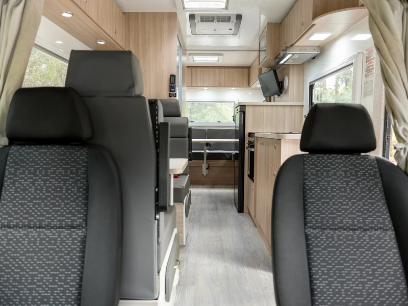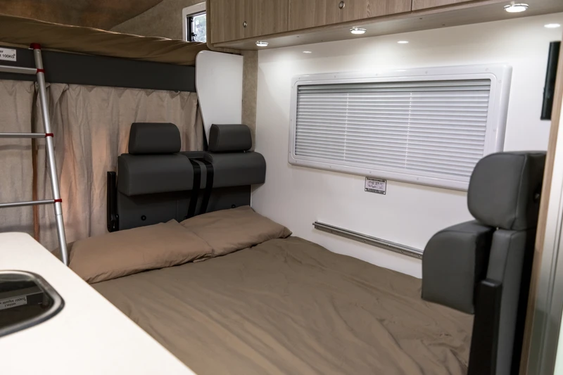 O River acomoda até 6 adultos e oferece um interior generoso, ideal para grupos maiores. As áreas de pernoite são organizadas para que todos tenham um bom lugar para dormir, sem comprometer a circulação interna. O banheiro completo (toalete e ducha) e a cozinha completa mantêm o grupo independente, mesmo em roteiros mais longos ou em regiões com menos infraestrutura. Um motorhome indicado para quem quer transformar a estrada em um momento de convivência intensa.