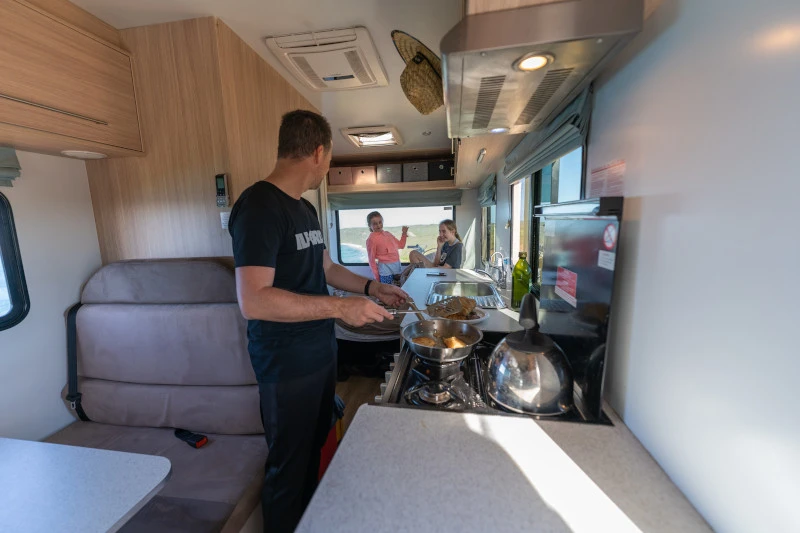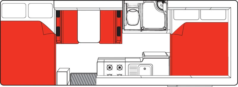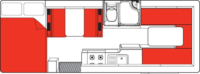 O Double Up é indicado para até 4 adultos e entrega um interior bem distribuído, pensado para grupos que desejam viajar juntos com conforto. O banheiro completo (toalete e ducha) aumenta a autonomia em trajetos mais longos. A cozinha completa e o refrigerador ajudam a manter o dia a dia mais organizado, com refeições preparadas no próprio veículo. Um modelo ideal para famílias ou amigos que priorizam conforto e praticidade.